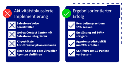 Definieren Sie Erfolg in geschäftlichen Begriffen, nicht in Plattformbegriffen. „Reduzierung der durchschnittlichen Bearbeitungszeit um 15 %“ ist ein Ergebnis. „Bereitstellung von Salesforce Voice“ ist eine Aktivität. Wenn Sie mit dem Ergebnis beginnen, können Sie messen, ob die Plattform tatsächlich liefert. Wenn Sie mit der Aktivität beginnen, messen Sie die Fertigstellung und machen weiter.